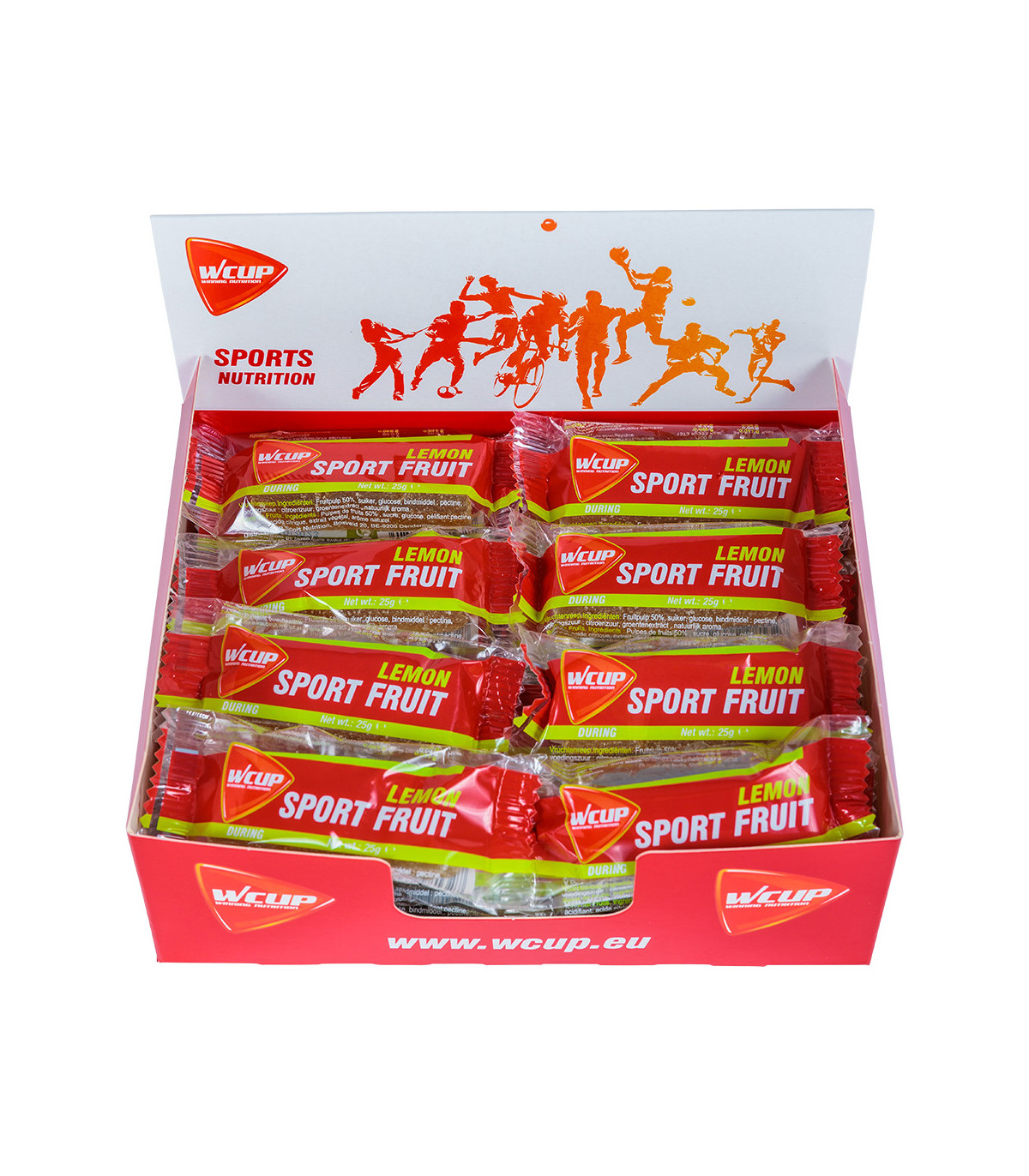 Pack 32x25g WCUP Sport Fruit Citron : Énergie rapide, ratio 2:1 glucose/fructose, 50% pulpe de fruit. Goût frais et texture fondante pour l'endurance.
